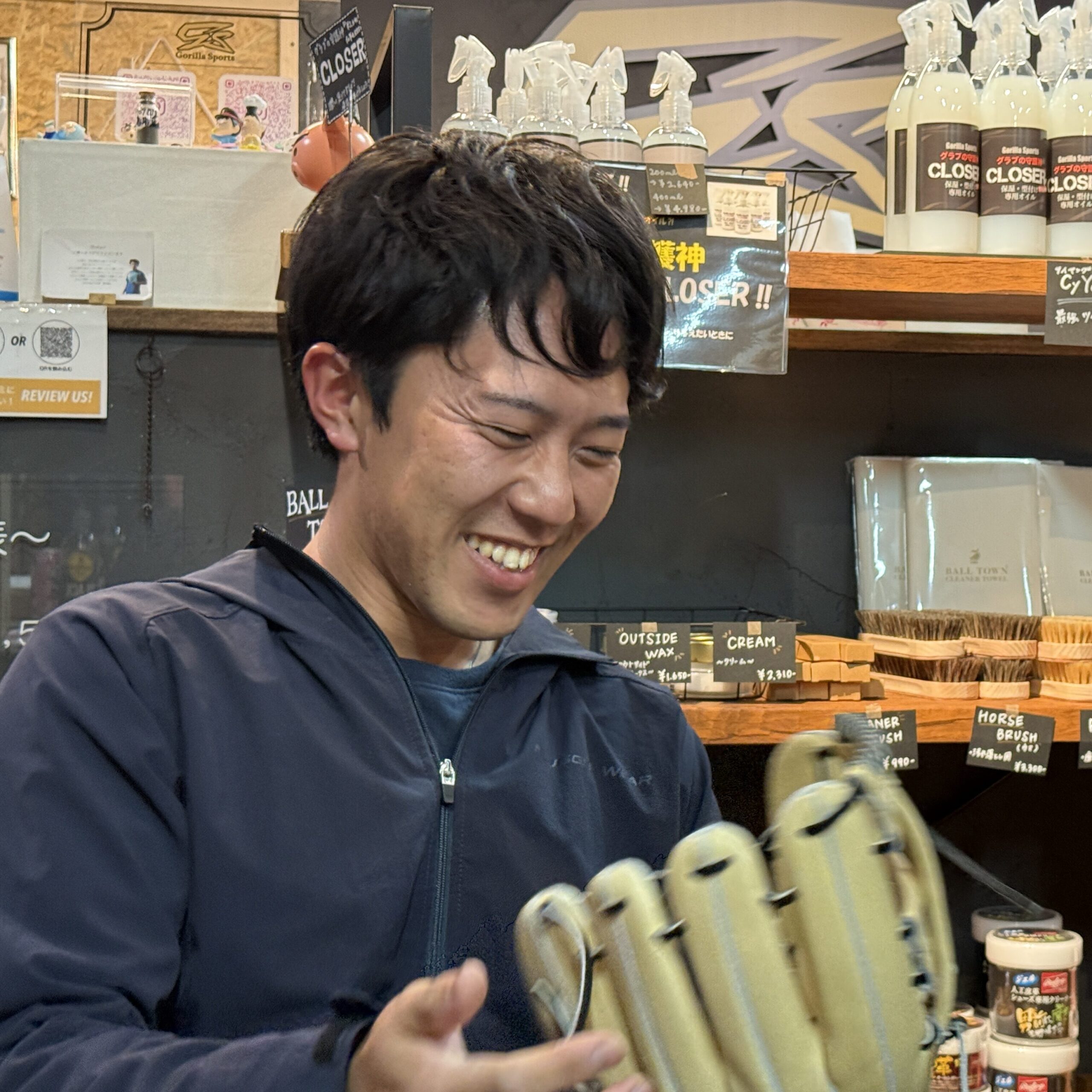 全国に約200名しかいない「ミズノ エキスパートリペアマン」資格保持者で、スラッガー本社の研修にも定期参加。メーカー特性を理解しつつ、プレイヤーの使用状況やクセに合わせた“実戦仕様の型付け”が持ち味。内野用グラブ、特に小中学生・女子選手向けのコンパクト仕上げが得意。プロ野球選手のメンテナンスや学校での講習も担当している。