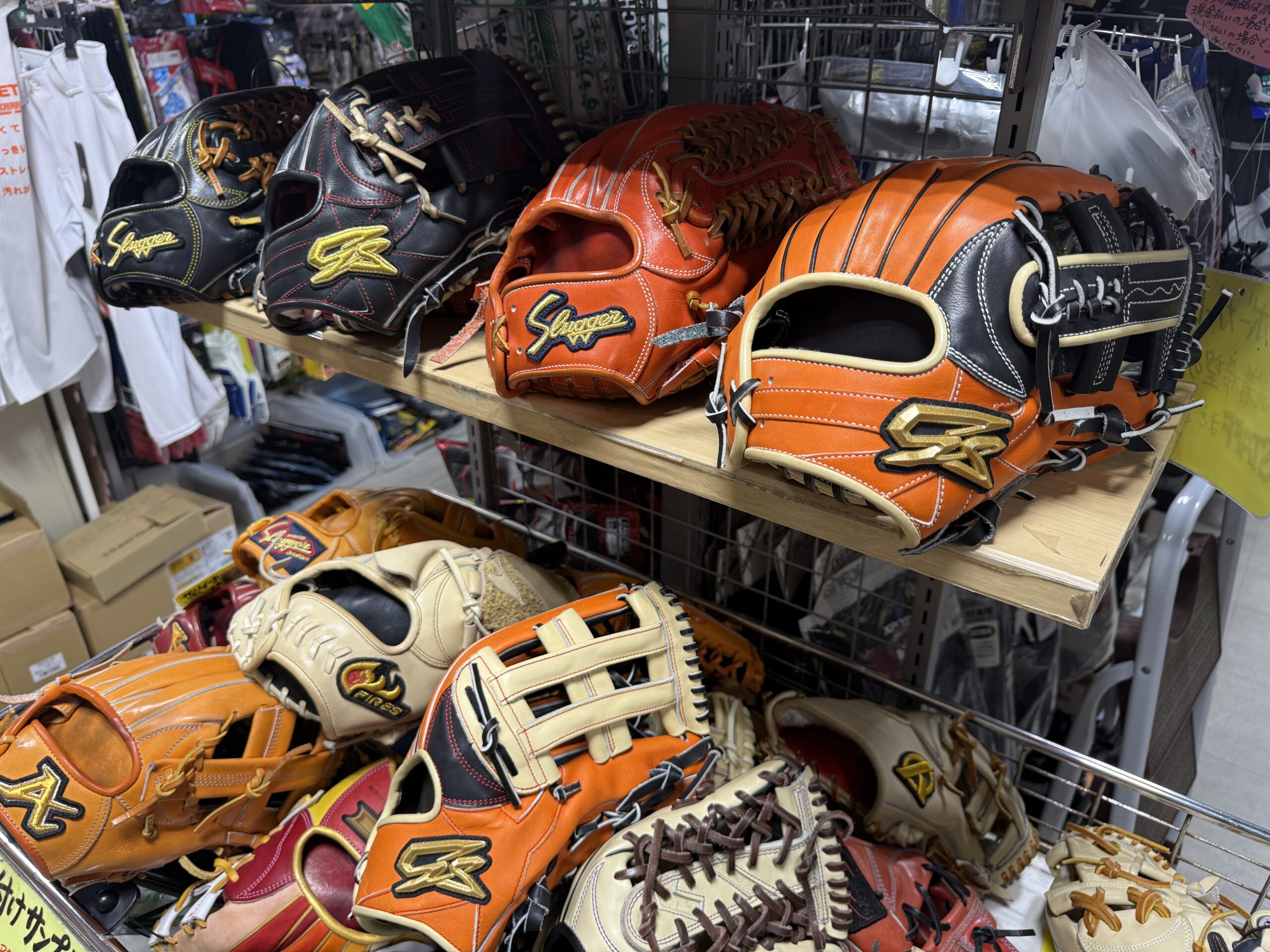 特にグラブの在庫は国内屈指で、およそ2,000個以上を常時展示。ミズノ、ゼット、SSK、スラッガー、ローリングスといった王道メーカーから、アメリカ発の44(フォーティーフォー)などの希少ブランドまで幅広く揃っています。