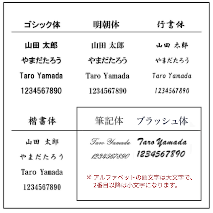 -ゴシック体明朝体行書体楷書体筆記体(英数字のみ)ブラッシュ体(英数字のみ)