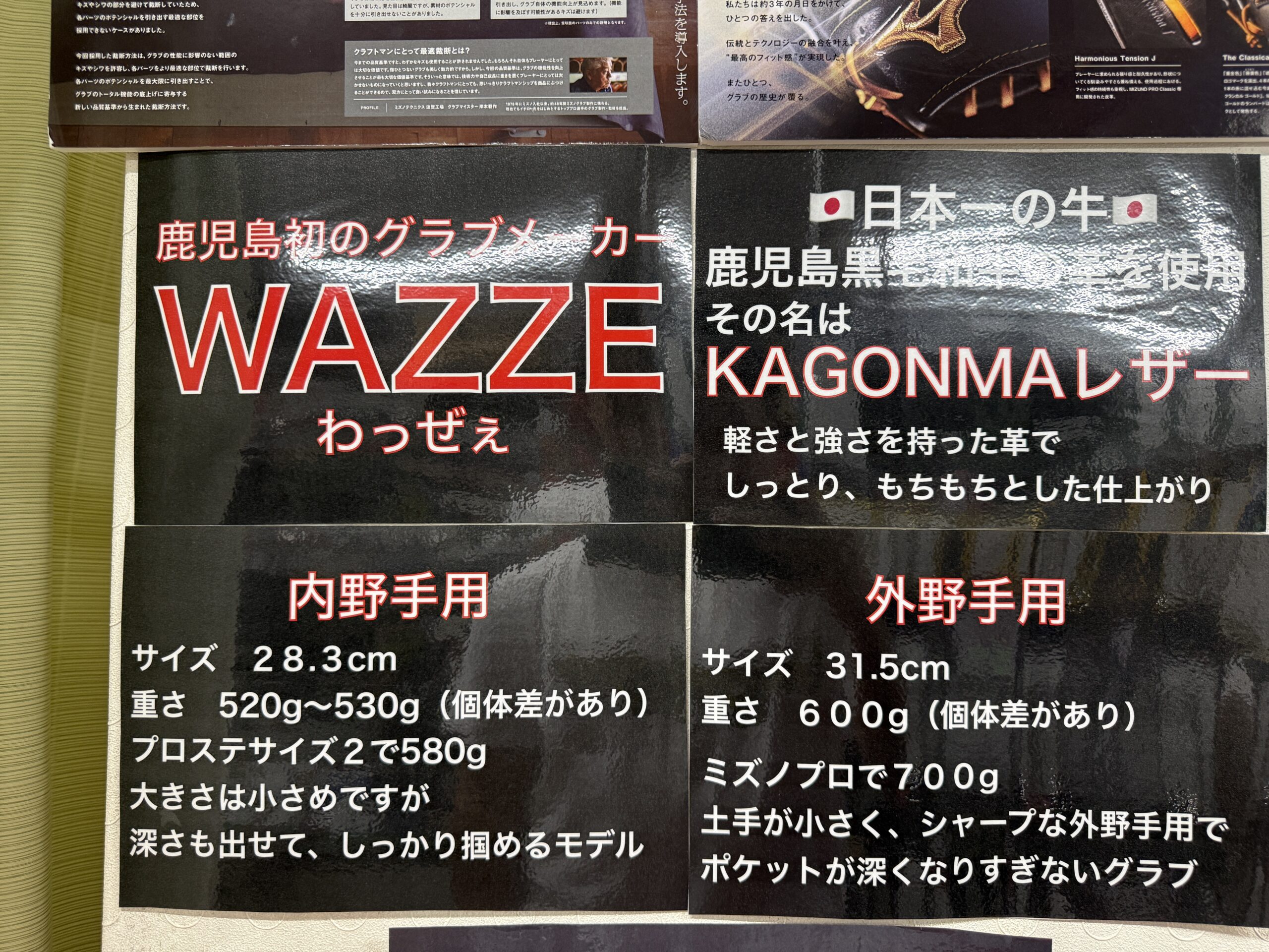 こちらは鹿児島発のグローブメーカー「WAZZE(わっぜぇ)」。意味としては「もの凄く。たいへんに。非常に。怖ろしい。」といった感じ。