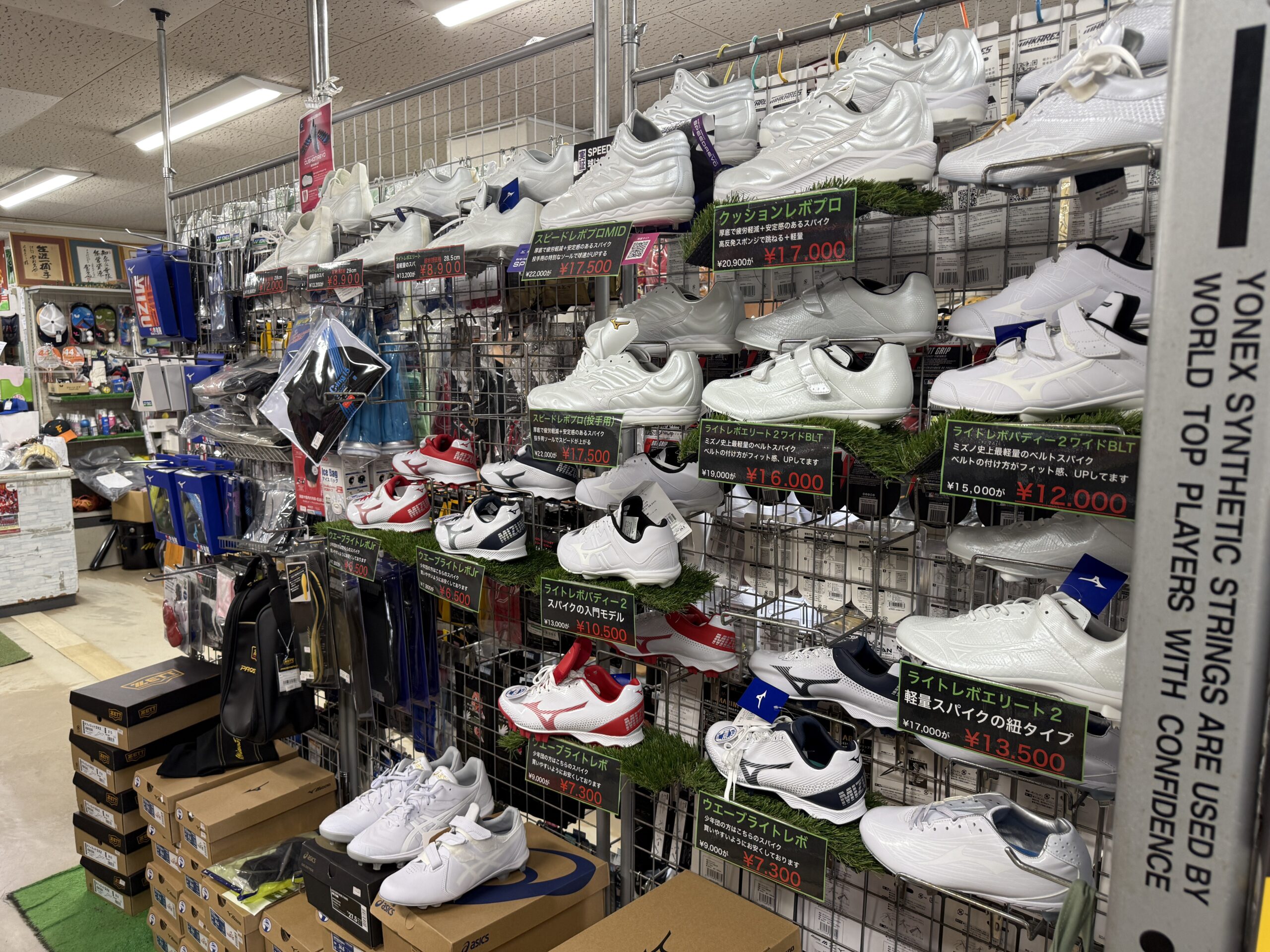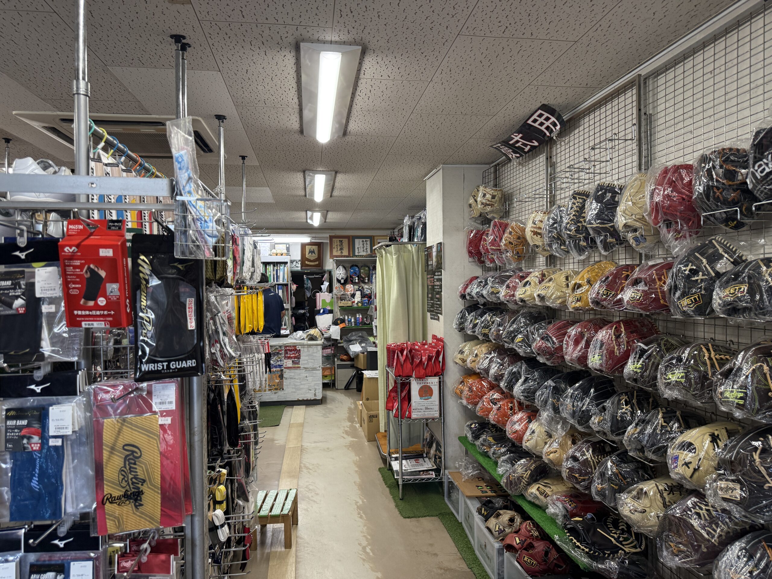 辻原スポーツ(鹿児島)の店内はこんな感じ。店内右側にはグローブが、店舗真ん中にスパイクやシューズ、バッティンググローブが、店舗左側の壁にはウェア類などが陳列されています。